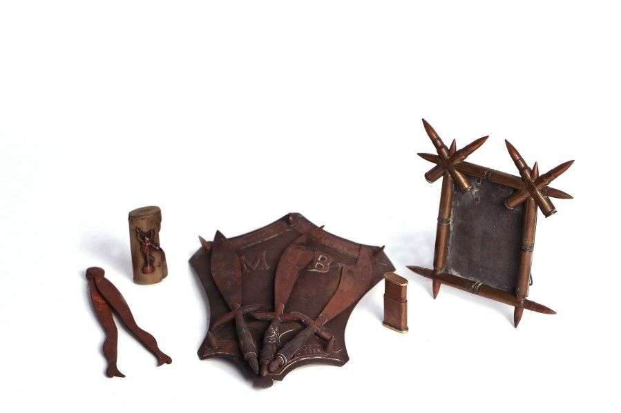 Travaux dit de poilus. Lot: cadre pour photo, écu avec 3 coupes papier, ca