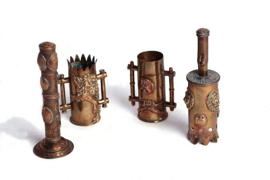 Travaux dit de poilus. Lot: 2 vases, un briquet, et une cloche