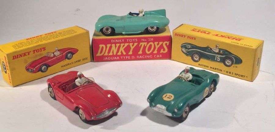 Lot de 3 DINKY TOYS comprenant une MASERATI SPORT 2000 ref 22A, une ASTON MARTIN DB3 ref 506 et une JAGUAR Type D ref 238, les 3 en boîte