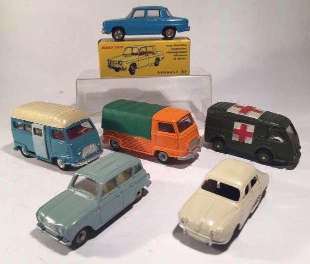 Lot de 6 DINKY TOYS comprenant une RENAULT DAUPHINE ref 24 E, une RENAULT 4L ref 518, une RENAULT 8 ref 517 en boîte, une RENAULT ESTAFETTE ref 565, une RENAULT ESTAFETTE PICK UP ref 563 et une RENAULT