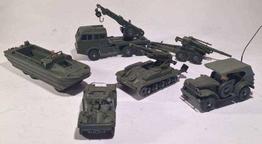 Lot de 6 DINKY TOYS militaires comprenant une automitrailleuse PANHARD ref 814, un DODGE COMMAND CAR ref 800, un DUKW amphibie ref 825, un char automoteur ref 813, un BERLIET tous terrains ref 824 et un canon obusier 155 ref 80 E