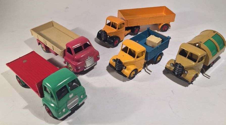 Lot de 5 camions DINKY TOYS comprenant un GUY plateau ref 512, un BEDFORD plateau ref 522, un BEDFORD semi remorque ref 409, un BEDFORD plateau benne ref 25 M et un BEDFORD camion poubelle ref 252
