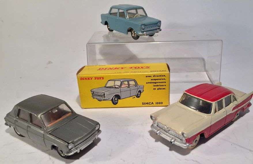 Lot de 3 DINKY TOYS comprenant une SIMCA 1100 ref 1407, une SIMCA CHAMBORD ref 24 K et une SIMCA 1000 ref 519 en boîte
