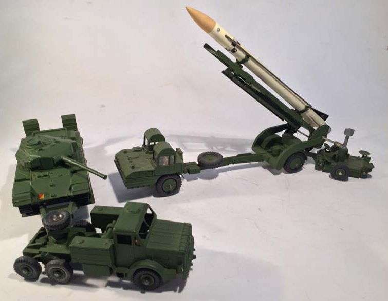 Lot de 3 DINKY TOYS militaires comprenant un tank CENTURION ref 651, un porte fusée missile LAUDING ref 666 et un porte char THORNY CROFT MIGTHY ANTAR ref 660