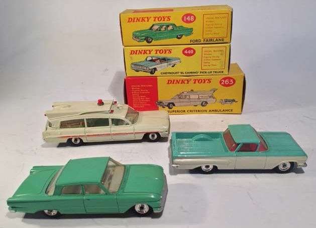 Lot de 3 DINKY TOYS neuves en boîte comprenant une FORD FAIRLAINE ref 148, une CHEVROLET EL CAMINO pick up ref 449 et une ambulance CRITERION ref 263