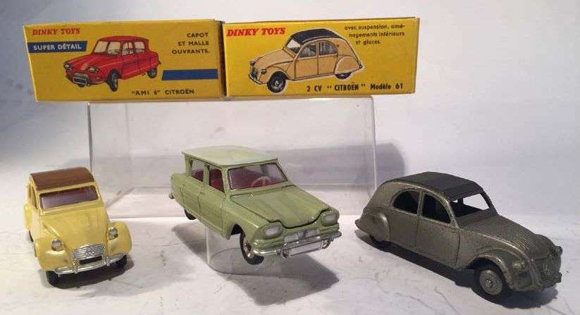 Lot de 3 DINKY TOYS comprenant une CITROEN 2 CV ref 24 T 53, une CITROEN 2 CV 1961 neuve en boîte ref 558, une AMI 6 neuve en boîte ref 557