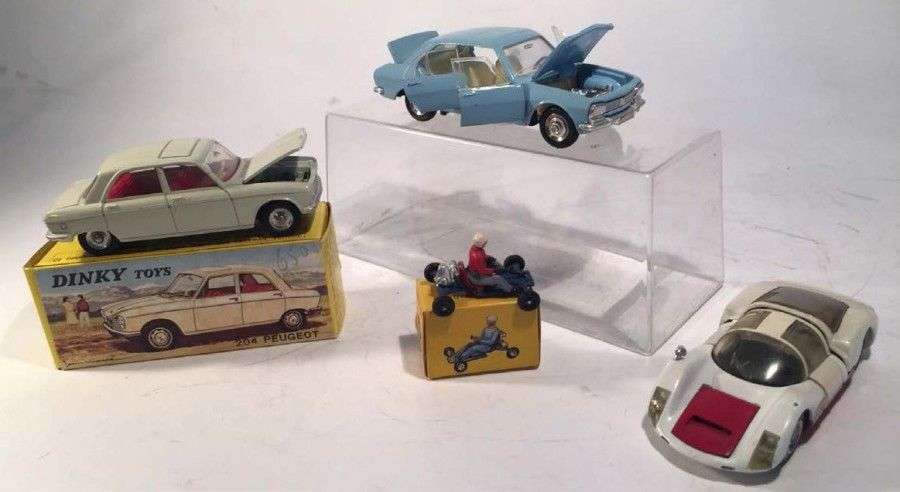Lot de 4 DINKY TOYS comprenant une PEUGEOT 204 neuve en boîte ref 510, un KART neuf en boîte ref 512, une PEUGEOT 504 ref 1415 et une PORSCHE CARRERA 6 ref 503