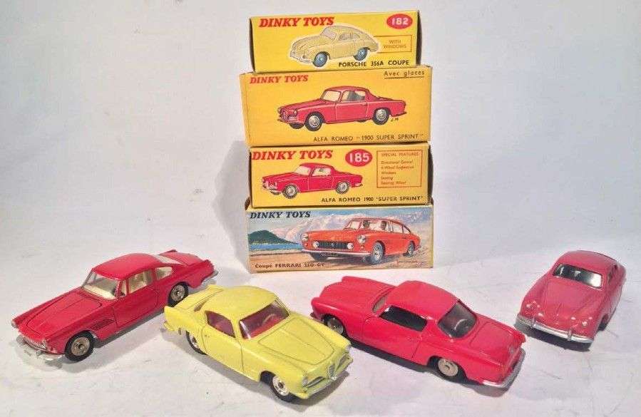 Lot de 4 DINKY TOYS neuves en boîte comprenant une FERRARI 250 GT ref 515, une PORSCHE 356 coupé ref 182, une ALFA ROMEO 1900 SUPER SPRINT ref 24 J et une ALFA ROMEO 1900 SUPER SPRINT ref 185