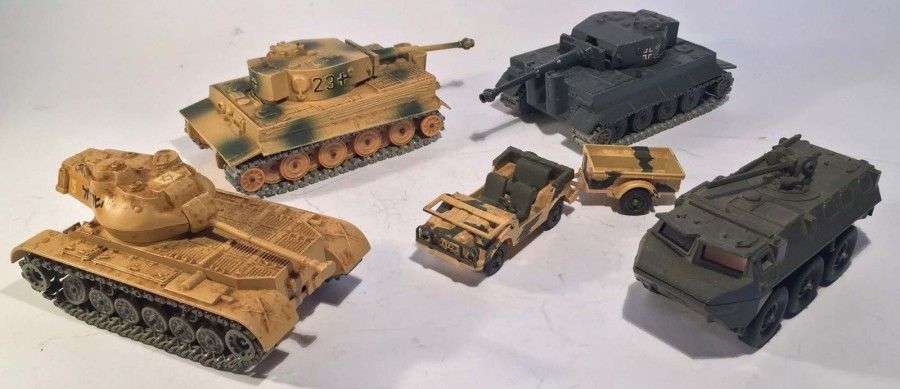 Lot de 6 engins militaires SOLIDO comprenant un VAB 6x6 ref 251, un char PATTON M47, une JEEP et sa remorque ref 212 et 213,deux chars TIGRE l'un kaki l'autre beige ref 222
