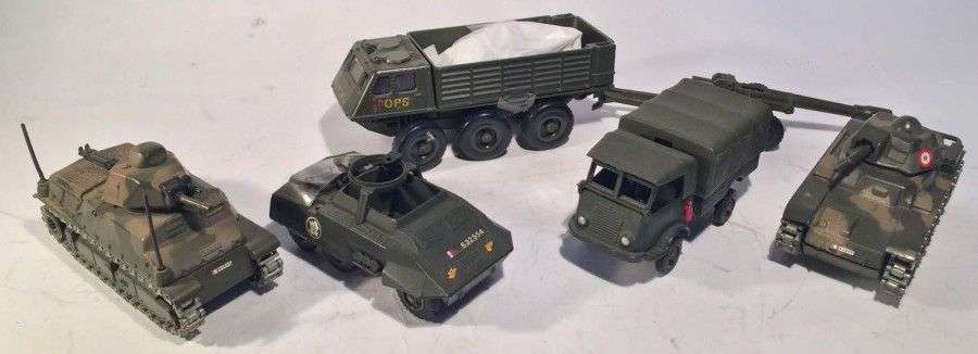 Lot de 6 engins militaires SOLIDO comprenant un char SOMUA S35 ref 234, un char RENAULT R35 ref 233, un camion BERLIET ALVIS ref 247, un canon ref 239, un RENAULT 4x4 et un COMBAT CAR M20