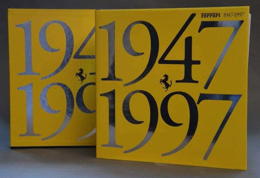 Livre Ferrari 1947-1997 du Cinquentenaire de la marque, sous emboîtage. Jaquette et emboîtage jaunes
