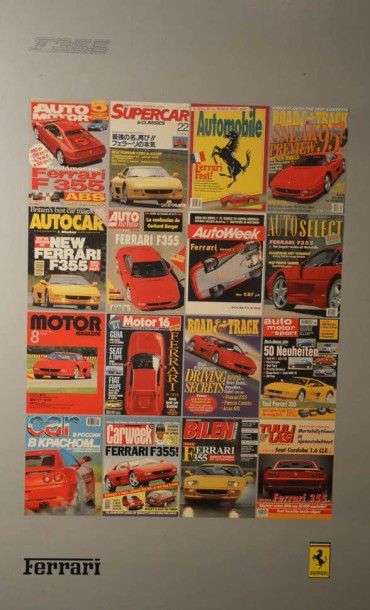 On joint une photo contrecollée sur bois, en couleurs, de couvertures de presse avec la Ferrari 355