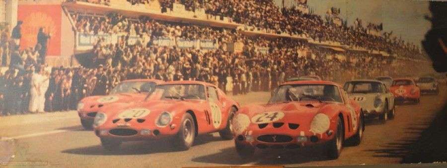 On joint une photo contrecollée sur bois, en couleurs, de la Ferrari 250 GTO en compétition