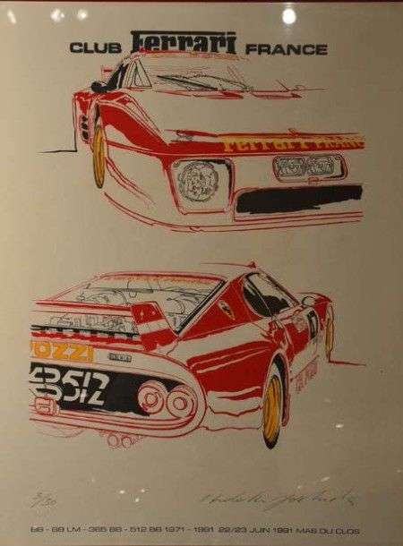 - Une affiche du club Ferrari France sur la BB 512 LM, tirage signé et justifié à la main par Yoshida, édition limitée, N°3/50