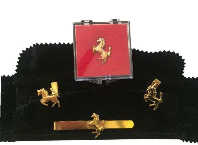 Lot comprenant deux boutons de manchette, une pince à cravate et une épinglette à l'effigie du constructeur Ferrari