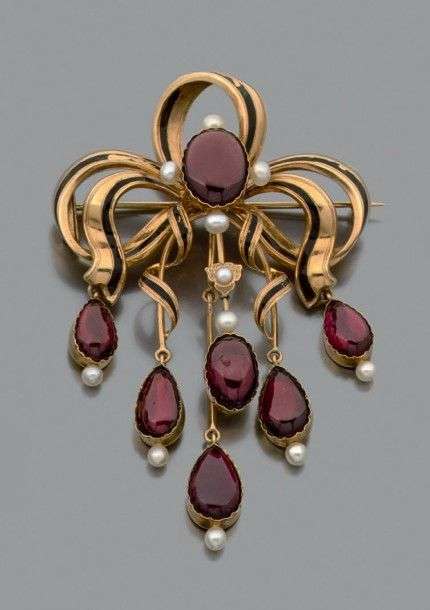 Importante broche "noeud" en or jaune 18k composée de rubans émaillés noirs rehaussés de petites perles fines retenant en pampille des grenats cabochons. Ecrin. Epoque Napoléon III.