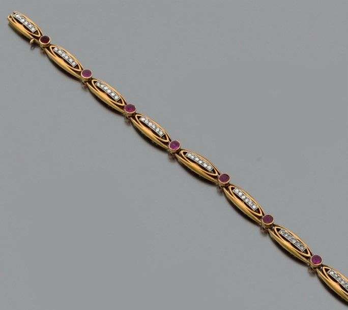 Bracelet en or jaune et gris 18k composé de motifs ajourés sertis de barettes de diamants taillés en rose alternés de rubis.