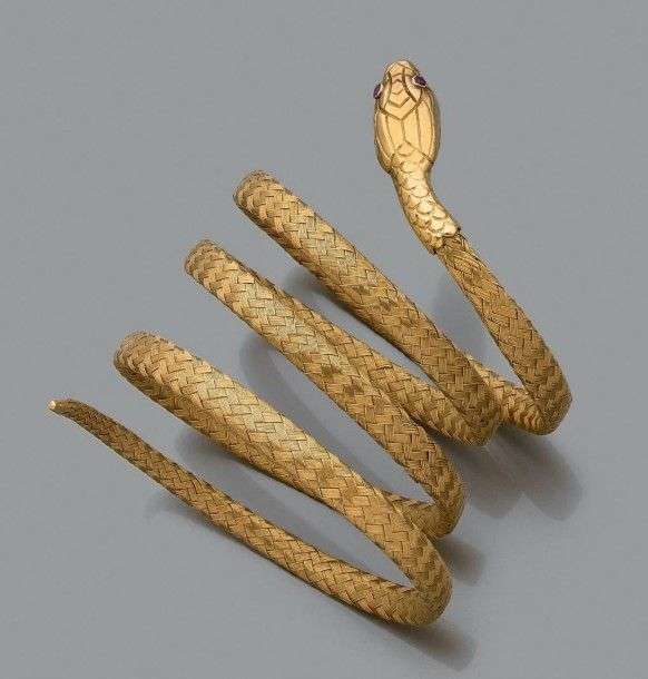 Bracelet "serpent" en or jaune tressé 18k, tête ciselée rehaussée de rubis pour les yeux. Epoque XIXème