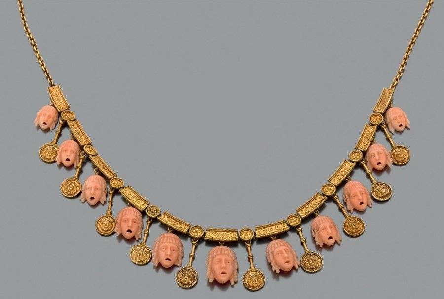 Collier composé d'une frise à l'antique en or jaune 18k filigrané retenant en pampille une alternance de breloques en or et de motifs de corail gravé. Dans un écrin V. PISCOPO & FIGLIO, Napoli Santa Lucia.