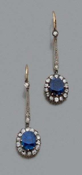 Paire de pendants d'oreilles en or jaune 18k et argent sertis d'un saphir ovale dans un entourage de diamants taillés en rose.