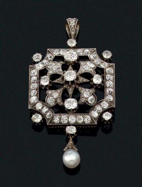 Pendentif en or rose 18k et argent composé d'une fleur stylisée dans un entourage de forme carré à pans coupés entièrement serti de diamants de taille ancienne et retenant en pampille une perle supposée fine. Epoque XIXème