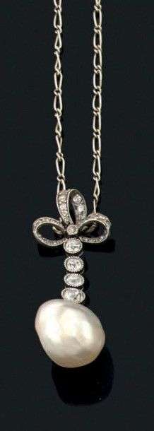 Pendentif en platine et or gris 18k composé d'un "noeud" serti de diamants de taille ancienne retenant une perle baroque probablement fine - non testée.