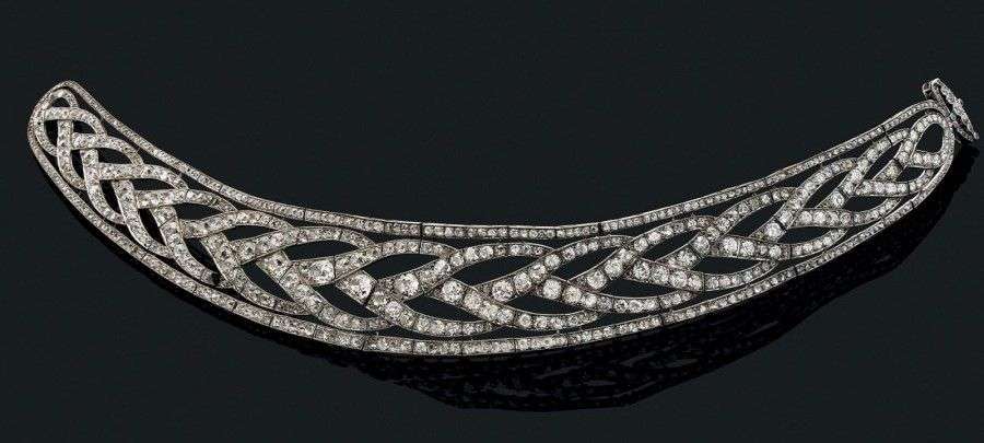 Collier ras de cou en platine et or gris 18k composé d'un ruban ajouré d'une tresse, l'ensemble serti de diamants de taille ancienne et de diamants taillés en rose. Fin XIXème début XXème.