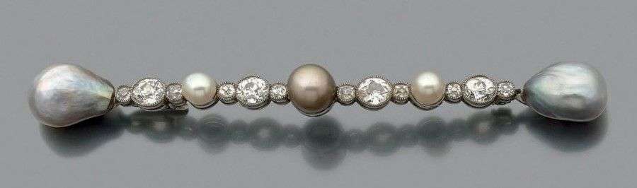 Elément de barette en or gris 18k serti de diamants de taille ancienne alternés de trois perles supposées fines non testées blanches et brunes et épaulés de deux importantes perles fines baroques de couleur grise de forme poire.