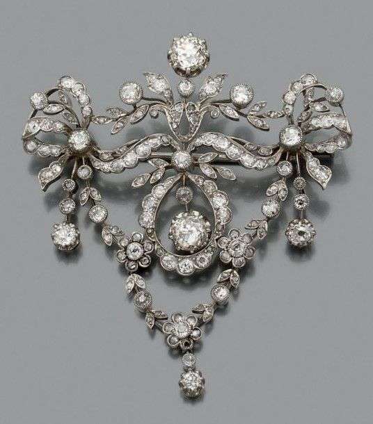 Broche - pendentif en platine formant une guirlande de fleurs et de rubans sertie de diamants de taille ancienne. Vers 1910.