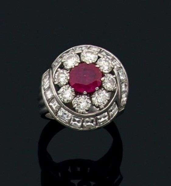 Bague dôme en platine sertie d'un rubis dans un double entourage de diamants de taille brillant et de diamants de taille baguette