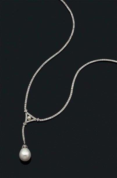Collier en platine et or gris 18k composé d'un tour de cou serti d'une ligne de petits diamants retenant en pampille un motif serti de diamants de taille ancienne orné d'une importante perle fine en goutte. Vers 1925.