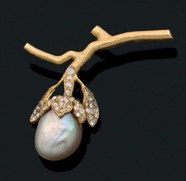 Broche en or jaune 18K sertie de diamants taillés en rose et ornée d'une perle fine baroque.