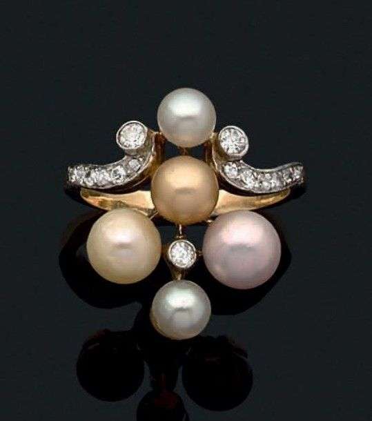 Bague en or jaune et gris 18k sertie de petites perles supposées fines - non testées, de différentes couleurs épaulées d'une ligne de diamants.