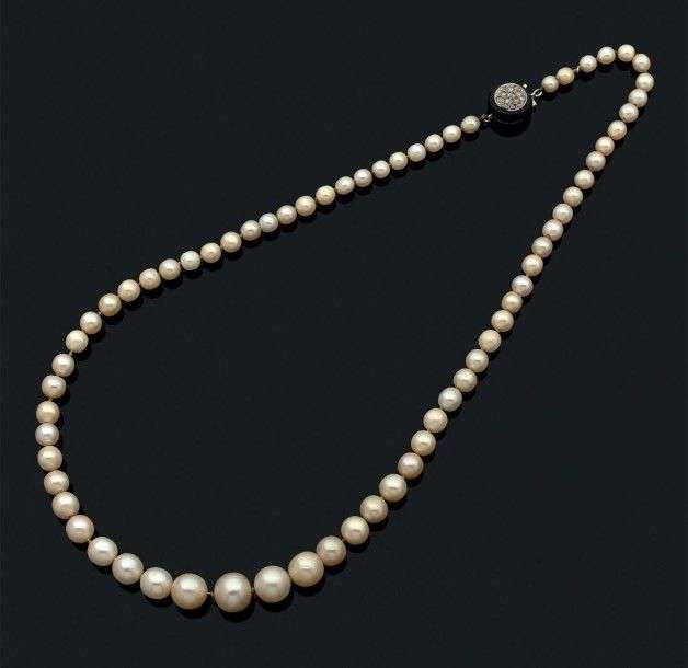 Collier composé de 69 perles fines en chute. Fermoir rond en or gris 18k orné d'un disque onyx serti de diamants taillés en rose. Pb.:32.6gr. Accompagné d'un certificat LFG N°316069 attestant perles fines, eau de mer. Diam.:5.1- 10.4 mm env.