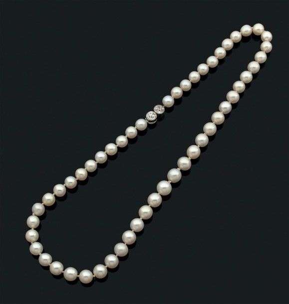 Composé de 51 perles fines en chute. Fermoir en or gris serti de deux diamants de taille ancienne. Poids brut : 37.48 gr. Accompagné d'un certificat LFG n° 316381 attestant perles fines, eau de mer