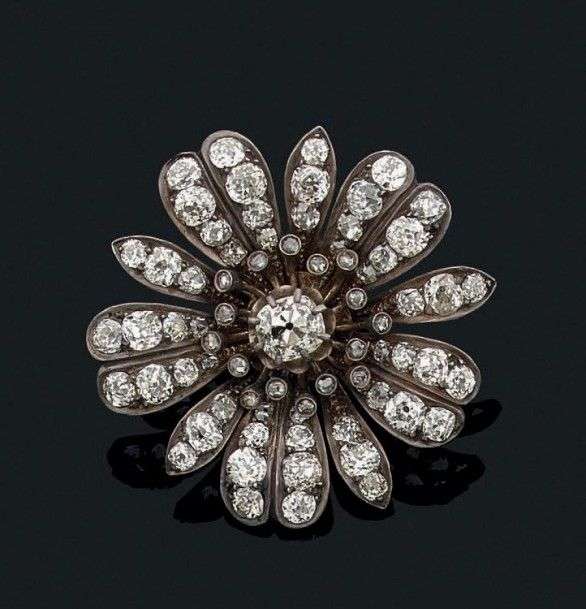 Broche - pendentif "fleur" en or 18k et argent sertie de diamants de taille ancienne. Epoque XIXème