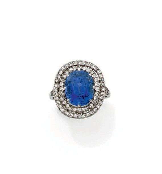 Bague en platine sertie d'un saphir ovale dans un double entourage serti de diamants de taille brillant.