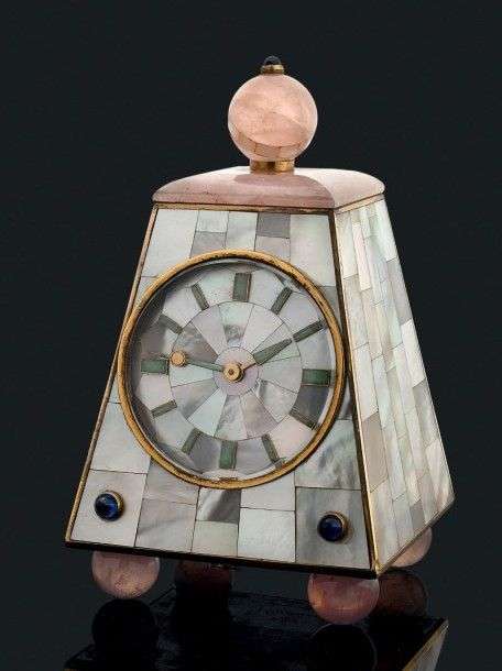 Pendulette de forme pyramidale en or jaune 18k et argent à décor de marqueterie de nacre et de quartz rose rehaussé de cabochons de saphirs. Le cadran est également orné d'une marqueterie de nacre, index et aiguilles baton en or jaune et émail vert clair.