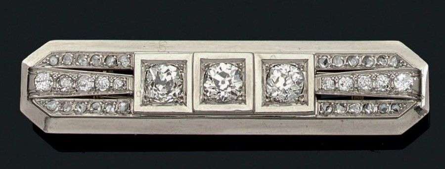 Broche en or gris 18k et platine ajourée sertie de trois diamants de taille ancienne épaulés d'une barette de diamants de taille ancienne entre deux lignes de diamants taillés en rose. Vers 1940.