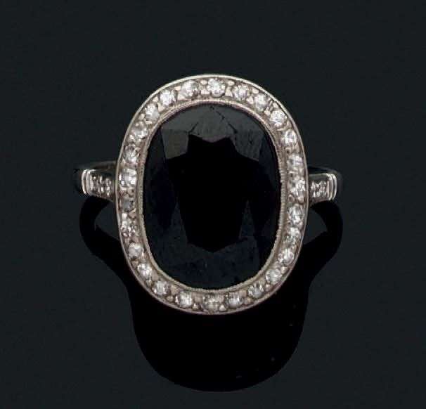 Bague en or gris 18k sertie d'un saphir ovale dans un entourage de diamants taille huit huit.
