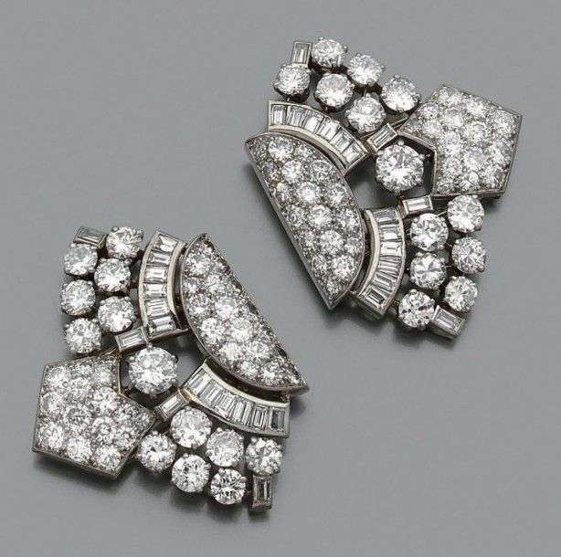Broche "double clip" en platine ajouré à motifs géométriques sertis de diamants taille ancienne, taille brillant et baguette. Système d’attache en or gris 18k. Vers 1930.