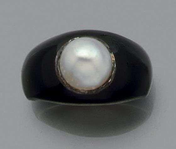 Bague jonc en argent émaillé noir ornée au centre d'une perle bouton supposée fine - non testée.