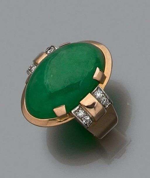 Bague en or jaune 18k serti d'un cabochon de jade épaulé de deux barettes