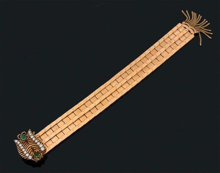 Bracelet "ceinture" en or jaune 18k articulé, fermoir composé de feuilles stylisées rehaussées de brillants et de fleurettes rehaussées d' émeraudes cabochons. Vers 1940