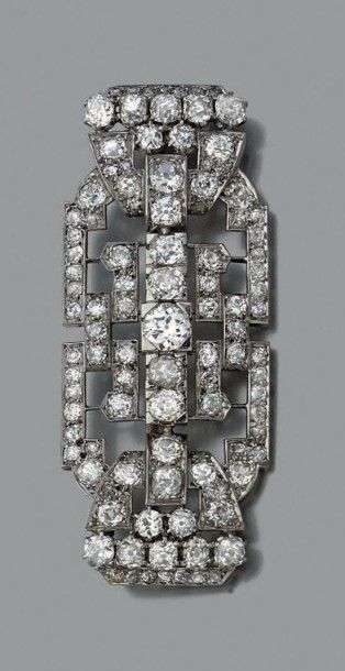 Grande broche "plaque" en platine et or gris 18k entièrement sertie de diamants de taille ancienne rehaussée au centre d'une ligne de diamants plus importants. Vers 1930