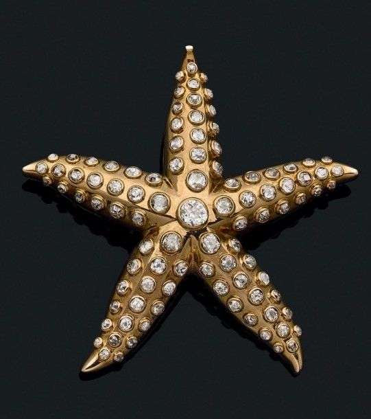 Broche "étoile de mer" en or jaune facetté entièrement sertie de diamants de taille ancienne. Poinçon de maître Roger Davière. Dim.: RECTIFICATIF env 6.5 cm. Pb.:21.7gr