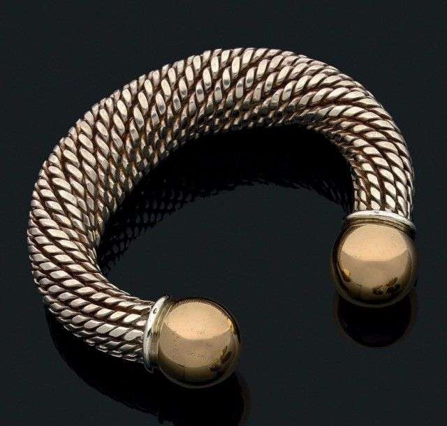 Bracelet jonc semi rigide, modèle "corde" en argent torsadé et or jaune 18k. Signé et poinçon de maître.