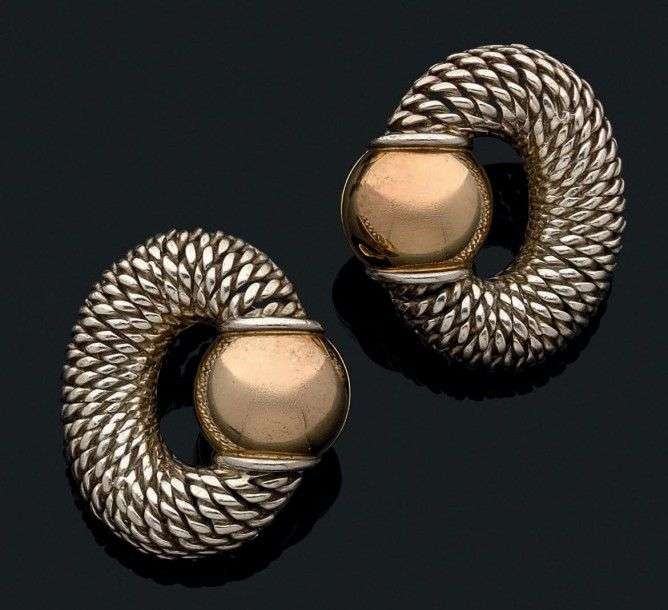 Paire de clips d'oreilles modèle "corde" en argent torsadé et or jaune 18k.