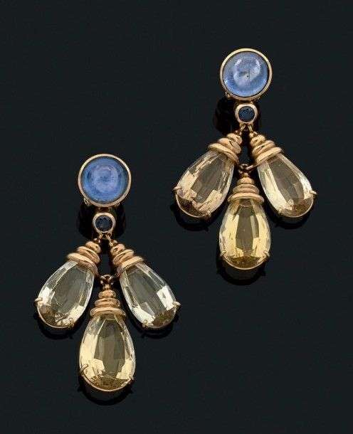 Paire de clips d'oreilles en or jaune 18K composés d'un saphir cabochon et d'un saphir facetté retenant en pampille trois citrines de taille poire rehaussées d'un culot en or jaune 18k godronné. Poinçon de maître.