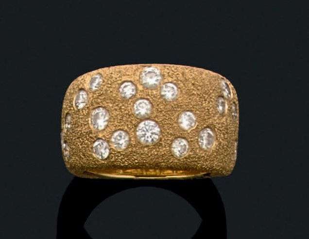 Bague jonc en or jaune mat grainelé 18k pavée de diamants de taille brillant.